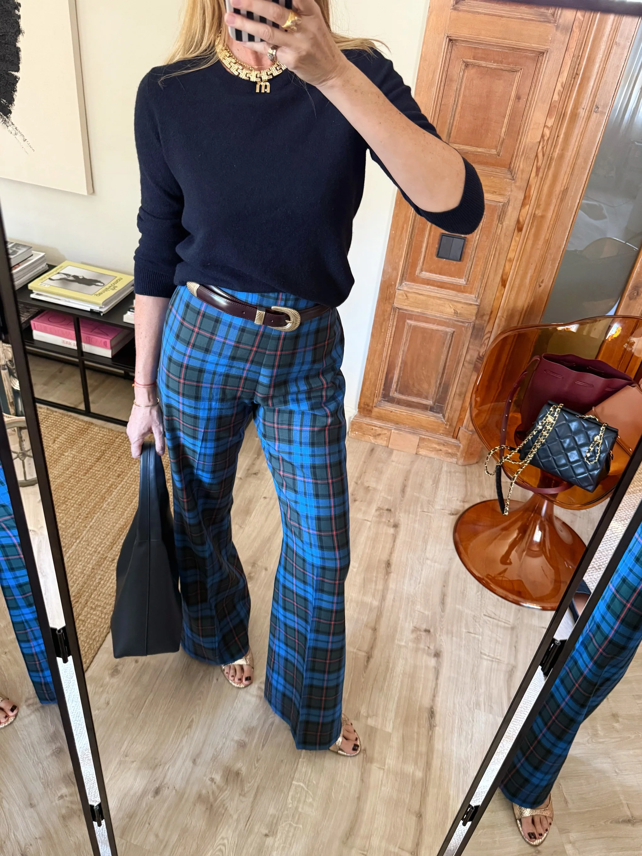 These high-waisted trousers are tailored from exclusive Liberty Fabrics, renowned for its premium quality and soft touch. The vibrant blue tartan. The wide-leg silhouette offers comfort and elegance, perfect for statement dressing with timeless flair. With elastic waistband.