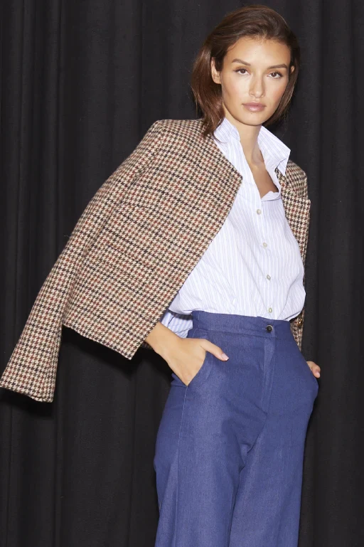 The Lu jacket, a classic piece reissued in the perfect brown houndstooth 100% pure new wool tweed. Ideal as an outer jacket or to wear it as a main piece. An essential design that you will keep forever.
