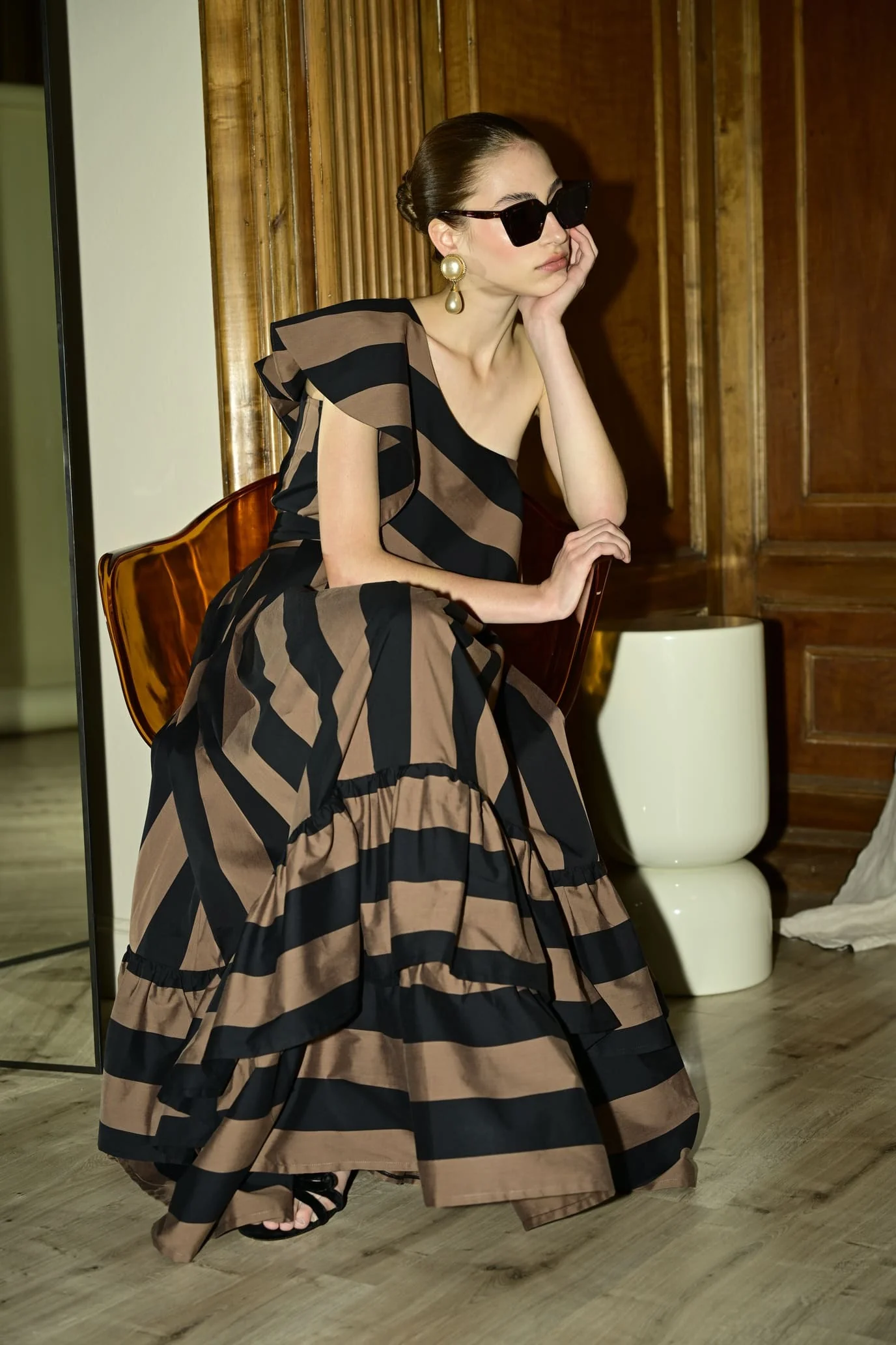 This statement maxi skirt is made from premium brown and black fabric. With architectural pleats, a high-rise structured waistband, and a tiered hem. A timeless silhouette combining heritage craftsmanship and bold, modern femininity. In case of doubt we recommend you sizing up for optimal fit and comfort.