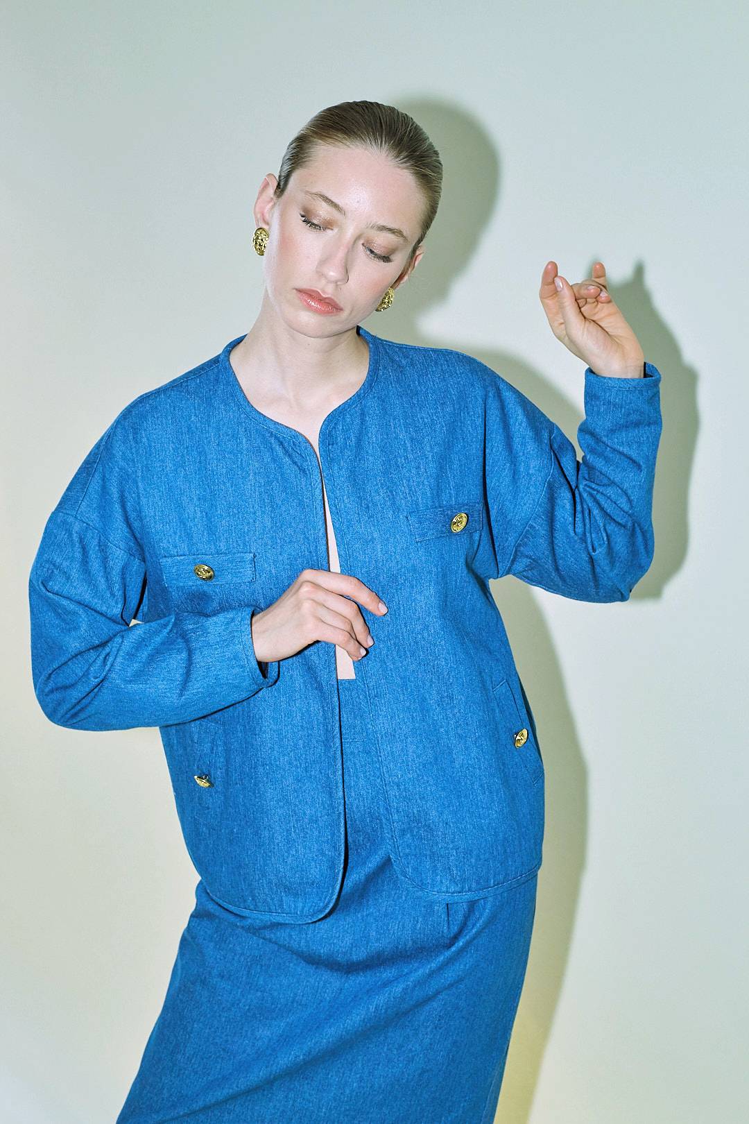 The Alizee jacket is a key piece for autumn days. It is handmade in our atelier with this cool denim fabric, 100% cotton, both on the outside and in the inside, combined with golden buttons. It has pockets for a more comfy style.