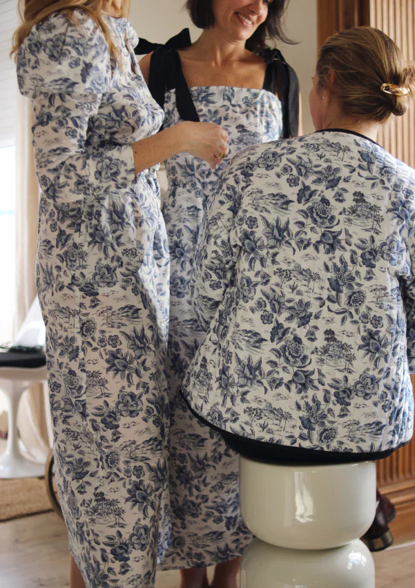 The Alizze quilted jacket is perfect for spring or those eternal summer nights. It is hand quilted in our atelier with this magnificent Liberty Fabrics Toile de Jouy fabric in blue and white, 100% cotton, combined with black trimmings.