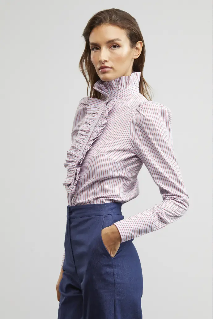An elegant, feminine and very chic blouse. With ruffle trim on the collar and placket, it will become one of your favourite designs due to its timeless cut. Its design, with puffed shoulders, makes it a very flattering blouse, perfect for any silhouette.